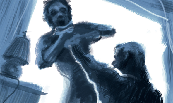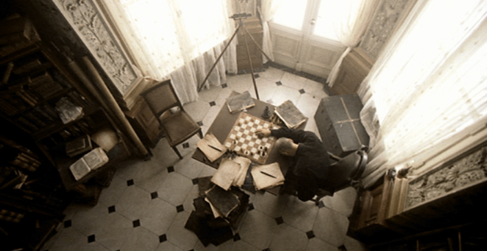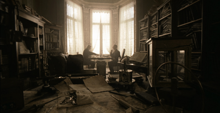 In einem antik eingerichteten Zimmer spielen zwei Männer
